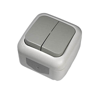 Двухклавишный выключатель Viko Palmiye IP54 накладной, цвет серый, в сборе. Предназначен для сетей до 250 В на ток до 10 А. Выключатель влагозащищенный, соответствует классу защиты IP54. Это означает, что он обладает защитой от накопления пыли и от брызг воды. Подходит для установки на открытых балконах и в санузлах. Пыль может проникать в корпус в незначительном количестве, не препятствующем нормальной работе оборудования. Полная защита от прикосновения к токоведущим частям выключателя и от проникновения твердых предметов._x000D_