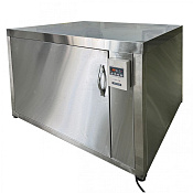 Тепловая подставка-тумба используется на предприятиях общественного питания и торговли для хранения и подогрева тарелок, а также кратковременного хранения готовых блюд в горячем состоянии. Модель оснащена распашной дверью с петлями слева. Корпус выполнен из нержавеющей стали AISI 430 толщиной 1 мм.