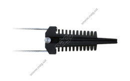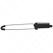 Натяжной зажим состоит из пластикового корпуса с зажимными невыпадающими клиньями и хомута из стального нержавеющего троса.