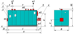 а1- вход воды; а2 – выход воды; а3 – дренаж DN 25; а4 – горелочная плита; а5 – уходящие газы; а6 – фланцы для предохранительных клапанов 1- корпус с теплоизоляцией; 2 – амбразура; 3 – каркас; 4 – рама; 5 – крышка задняя; 6- клапан взрывной. Рабочее давление воды , МПа (кгс/см2) – 0,6 ( 6 )