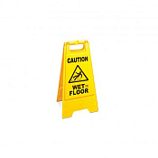 Знак «Скользкий пол» изготовлен из пластика ярко- желтого цвета и имеет раскладывающуюся конструкцию. Универсальное изделие предназначено для обеспечения безопасности посетителей во время влажной уборки торговых центров, ресторанов и других общественных учреждений. Знак используется также в местах, имеющих скользкий пол. Надпись на изделие нанесена черной краской